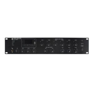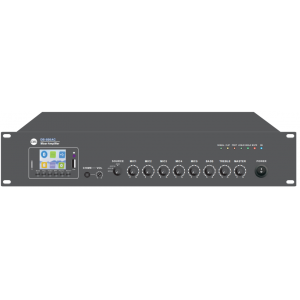产品特点: ◆ 采用国际标准2U氧化铝质拉丝面板工艺,带3分区工业标准一体化接线端及接口,外壳采用金属材料加强与地线的连接,保证具备可抗静电的功能额定功率输出:120W 240W350W500W ◆ 带3组定压分区输出,分区独立音量调节,定压定阻双应用接口100V或70V和40hms-8 0hms-16 0hms ◆ 面板带2.5寸液晶彩屏MP3/FM/播放显示,万能节目源播放器USB/SD和SD接口,支持MP3,WAVWMA,节目源读取播放具有Mic1(XLR)和Mic/Line输入2-3(6.3mm插孔),4个线路,2个话筒输入,一个电话输出,一个线路输出。Mic1VOX具有最高优先级带红...