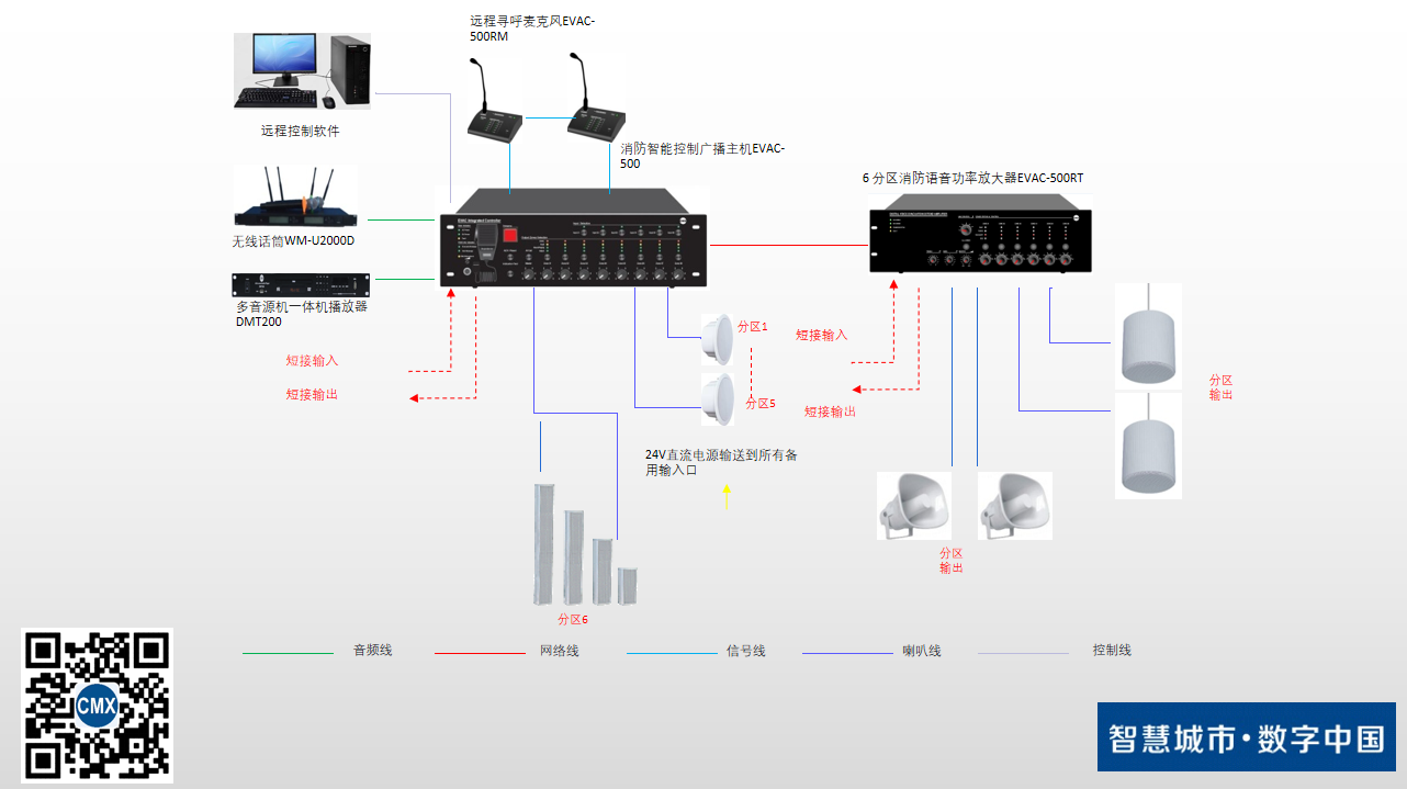 2、主控中心设计:消防智能控制广播主机EVAC-500、6 分区消防语音功率放大器EVAC-500RT、语音撤离远程呼叫站 EVAC-500RM ,多音源机一体机DMT200、远距离一拖二无线真分集话筒WM-U200D、电源时序器PA-100ST等组成。