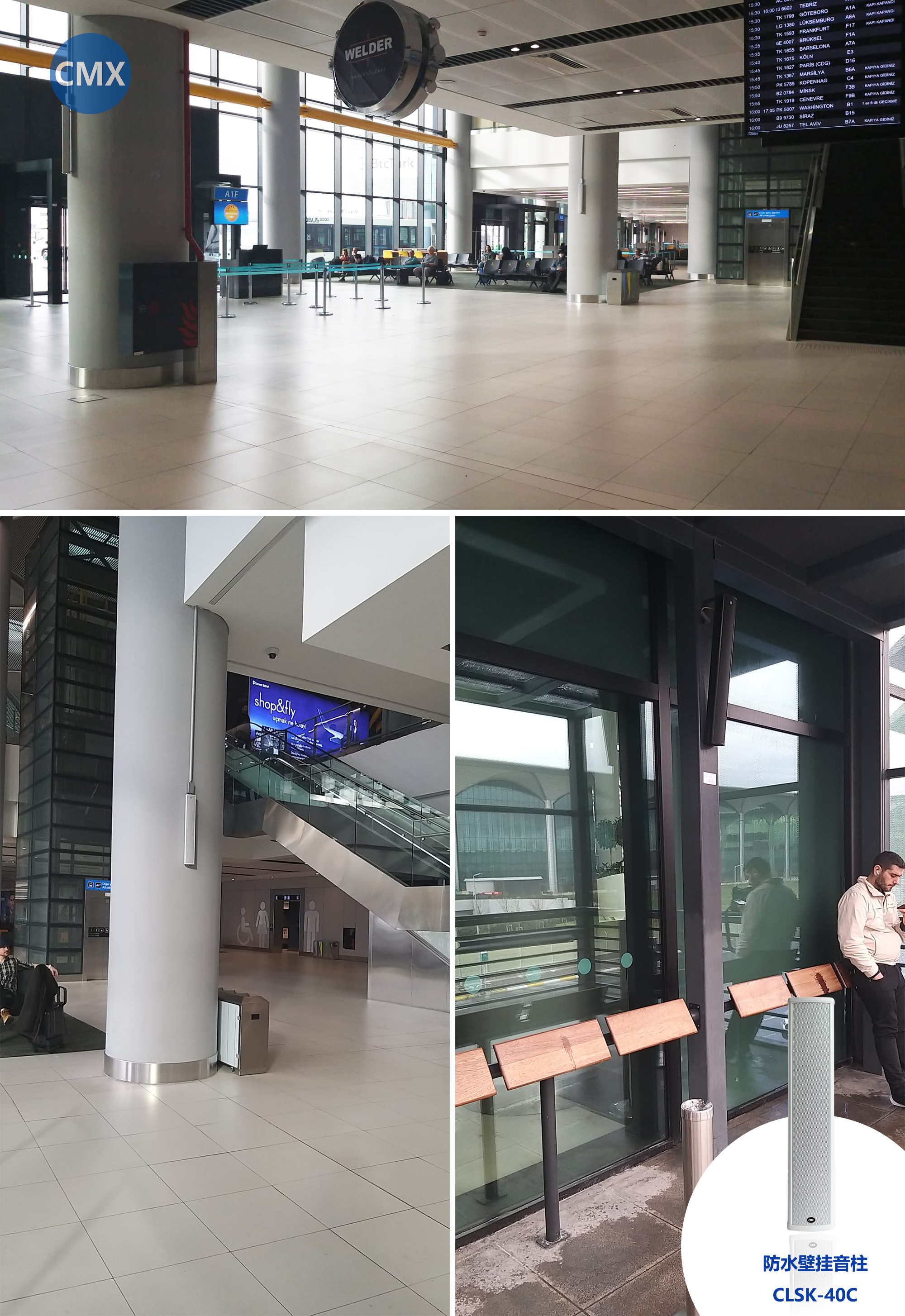 根据候机厅和吸烟区区域广,水泥柱多,户外防水等特点,现场水泥柱上选用CMX的防水壁挂音柱(CLSK-40C)。