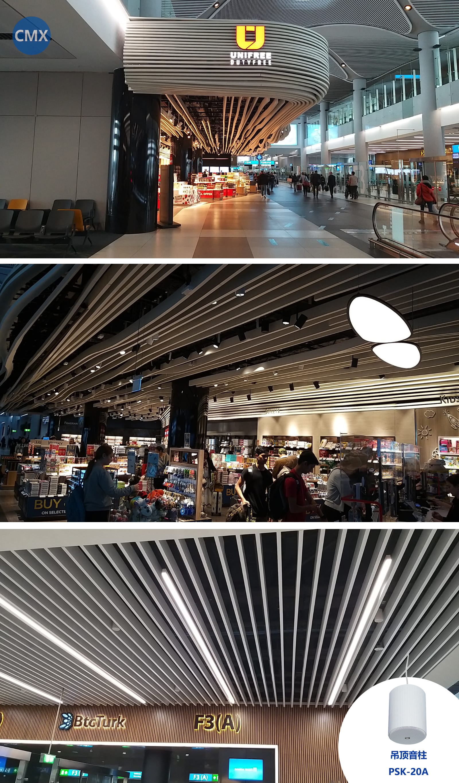 根据机场环境特点,我们把整个机场按不同区域区分,根据机场对公共广播的需求与美观,不同区域应用不同类型的喇叭。