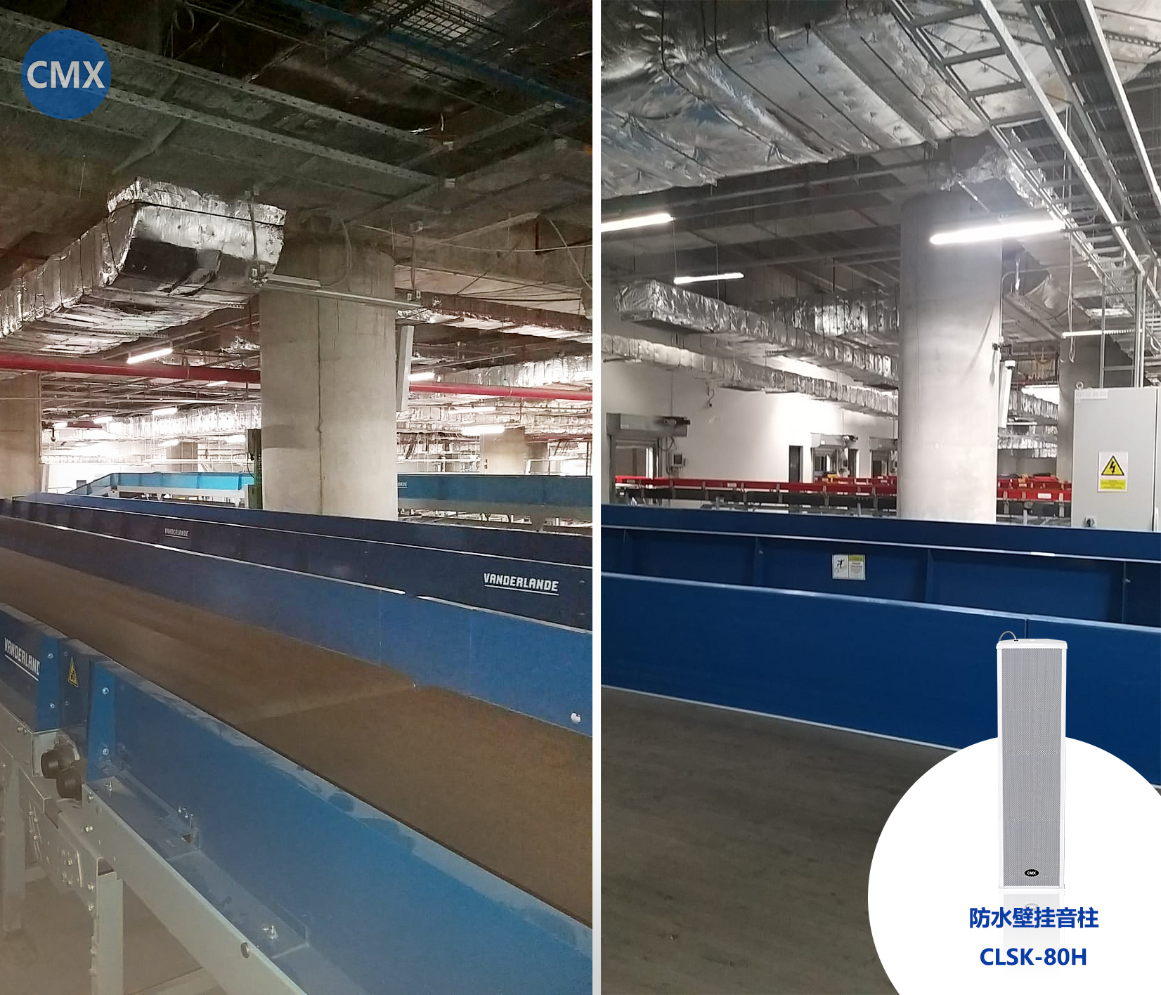 根据行李处理区区域广,水泥柱多等特点,现场水泥柱上选用CMX的防水壁挂音柱(CLSK-80H)。