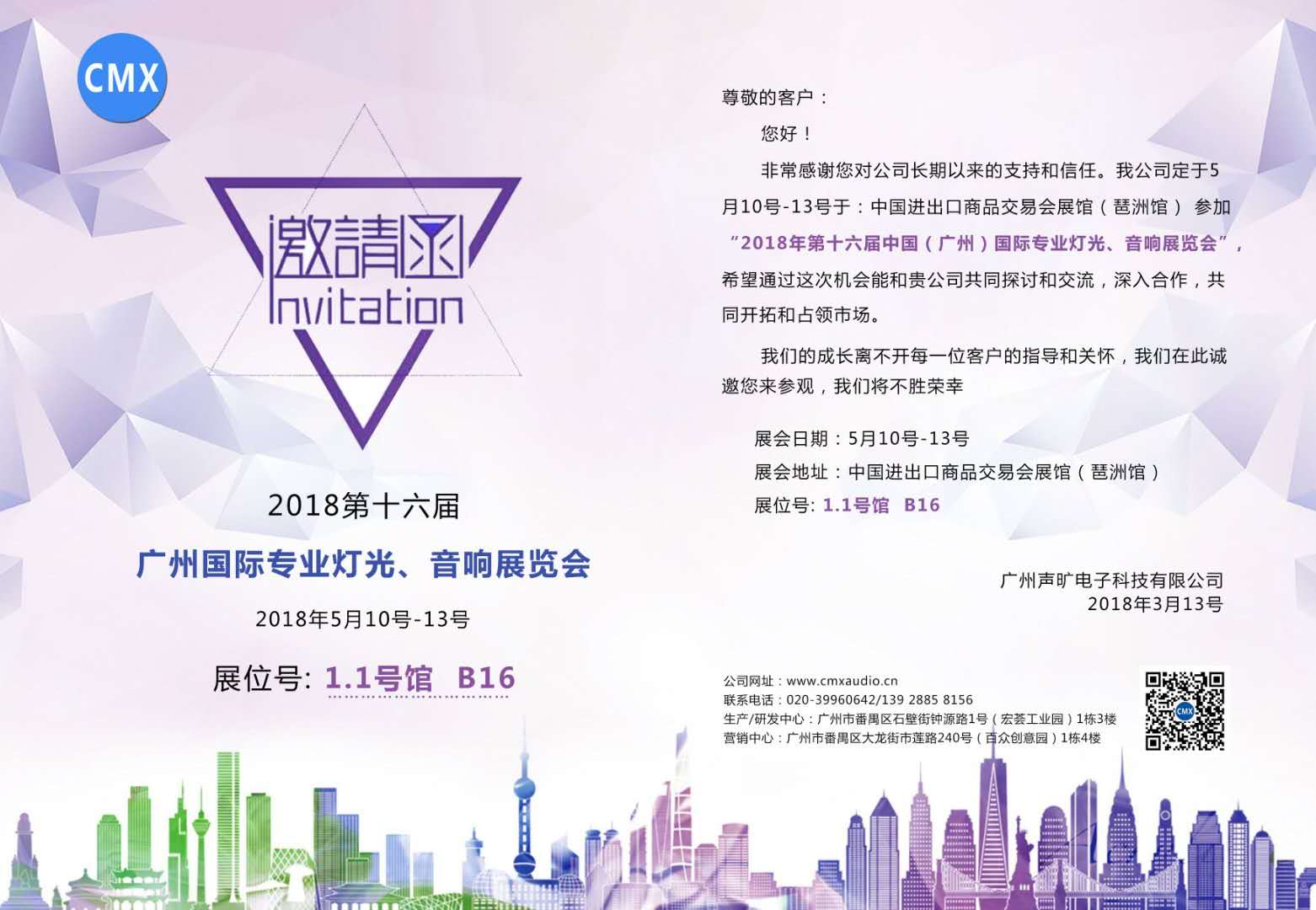 2018年第十六届广州国际音响、灯光展,展览 5月10日至5月13日 CMX 广播会议 展位号:1.1号馆B16