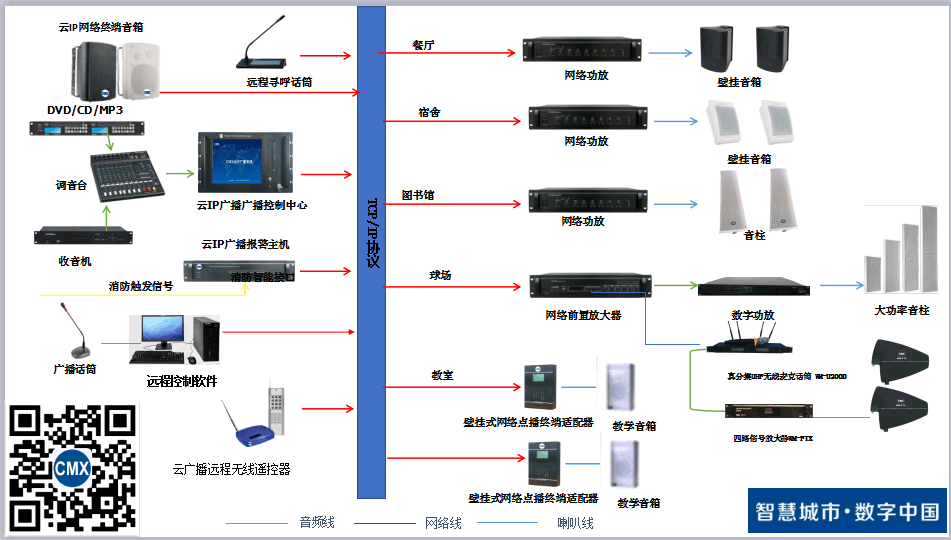传输:网络交换机,通信光纤,光纤接口,广播音箱线,室内音箱,室外音柱。