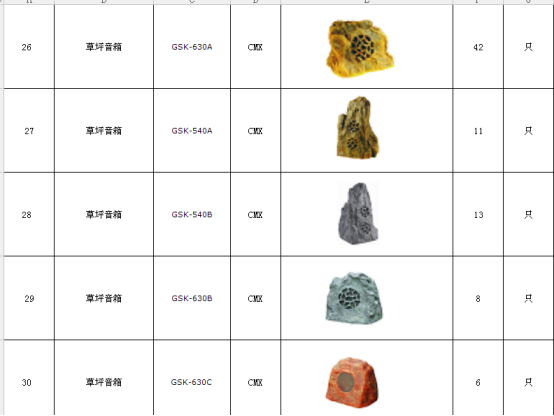 10、根据园区的情况,可选用仿真园林音箱,外形都是经过精心设计的埋地式扬声器。经过精心设计可与周围环境完全融合,其低矮的尺寸、特制的外形和表面处理工艺使其消失在几乎所有户外环境中:灌木丛、花园、池塘边等等,而不用特意隐藏于不合适的位置,选用室外豪华音柱的外形可挂墙及立杆室外安装,经过精心设计可与周围环境完全融合。该类扬声器不仅坚固耐用,而且具有灵活的多功能性,适合所有的户外场合使用。