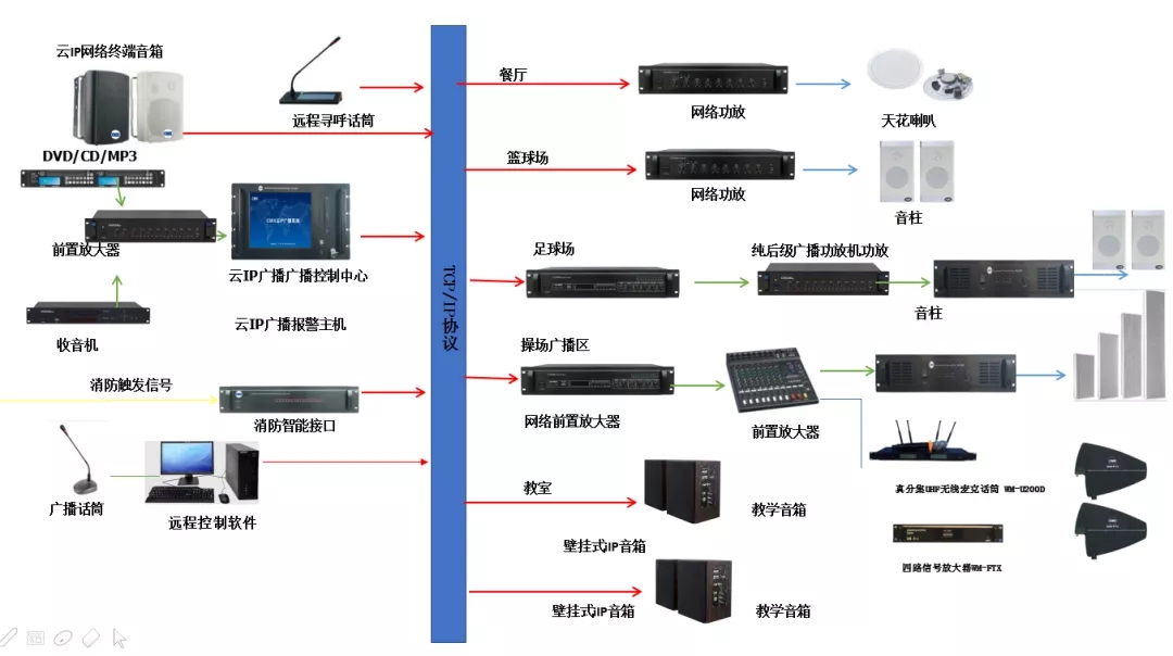 中学数字信息化建设的不断革新,中学的建设发展也受到国家和地方的日益重视,为完善现代化的教学管理, 营造更为舒适的中学教学环境,中学需要设计一套数字化的校园广播系统,要求广播覆盖每一个班级每个教学点及公共区同步,整个中学区的的各功能区室外环境,主要满足日常背景音乐的需求,兼顾校园广播通知、应急消防灾难性广播指挥等功能。