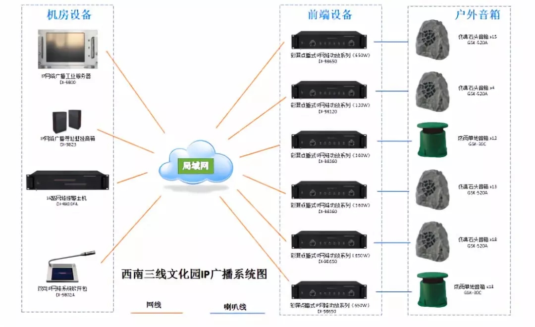 3、传输方面:园区的公共广播系统设计覆盖的面积很大,整个公园的公共广播系统如果采用传统广播系统不能解决信号远距离传输,也无法确保远距离传输信号的质量,传统广播传输音频信号经过长距离传输,很难保证音频信号,经常会引入噪音和电流声,利用IP网络广播系统,采用基于光纤网络传输,传输信号采用IP压缩数据包传输,保证信号传输不受距离限制,保证信号到达每个广播点的质量如一;