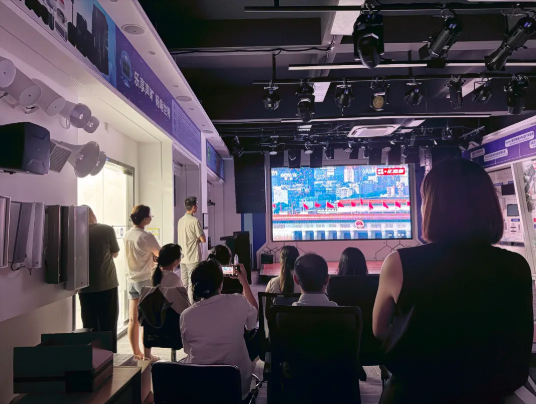 员工齐聚展厅,通过大屏幕收看阅兵盛况。天安门广场上,红旗招展、军容整齐,展示了我国强大的国防力量和团结奋进的民族精神。