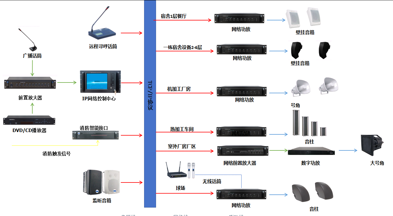 该广播系统在该方案中可在划分为区域中单独广播或全区广播。